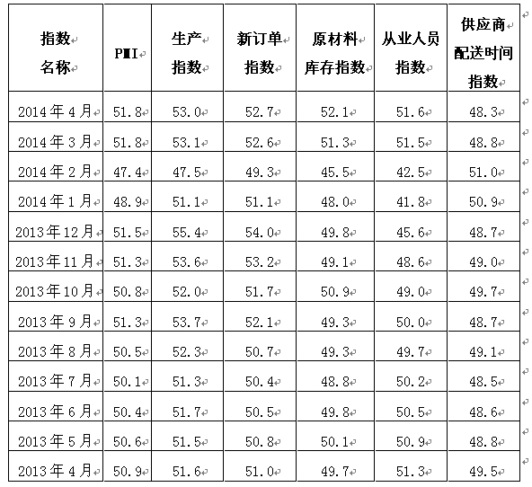 表1 2013年4月-2014年4月廣東省重點企業(yè)PMI主要分項指數(shù)值表