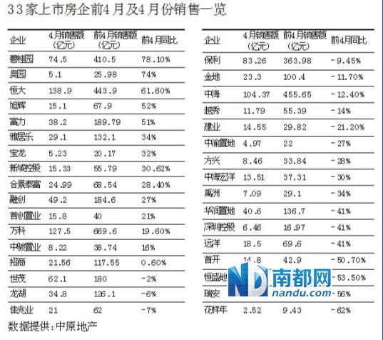中原地產(chǎn)首席分析師張大偉表示,這33家企業(yè)明顯出現(xiàn)了分化,其中19家企業(yè)同比出現(xiàn)了下調(diào),而且預(yù)計后續(xù)公布的企業(yè)中同比下調(diào)的比例將明顯增加。另外在14家同比上漲的企業(yè)中,同比成交情況,相比前3月明顯放緩,這表明了整體市場依然處于降溫過程中,二季度的銷售壓力將更大。