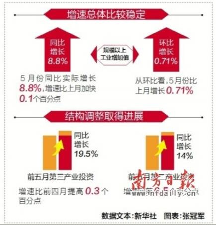國家統(tǒng)計局13日發(fā)布的報告顯示,5月份我國規(guī)模以上工業(yè)增加值同比實際增長8.8%,增速比上月加快0.1個百分點。