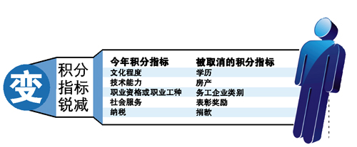 今年的積分指標及分值只設(shè)有“文化程度”、“技術(shù)能力”、“職業(yè)資格或職業(yè)工種”、“社會服務(wù)”、“納稅”5個項目,取消了原來比拼學歷、房產(chǎn)、務(wù)工企業(yè)類別、表彰獎勵、捐款等項目,比過去11大項明顯減少。