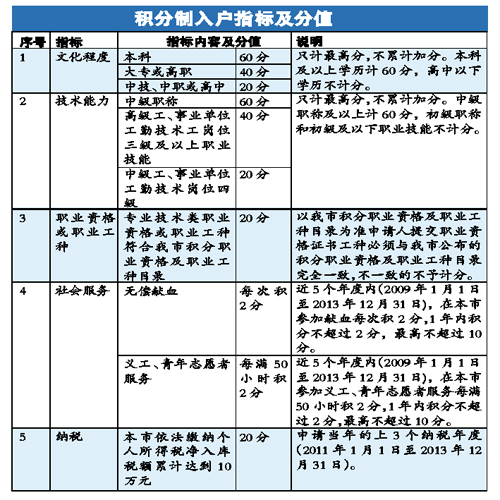 答:今年的積分入戶只設(shè)置了文化程度、技術(shù)能力、職業(yè)資格或職業(yè)工種、社會服務(wù)、納稅5項積分指標,比以往的11大項20多小項明顯減少。只要在5項積分指標中累計得分達到60分即可進入“入戶門檻”,具有積分制入戶申請資格。