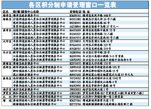 答:可在工作時間撥打各積分制入戶受理窗口咨詢電話(見左表),或市來穗人員服務(wù)管理局積分制入戶咨詢電話:28352640。