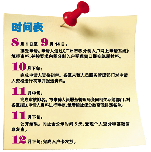 2014年廣州市積分制入戶工作正式啟動,15條實施細則新鮮出爐。昨天,廣州市政府通報,今年積分制入戶指標總量為3000個,由新成立的廣州市來穗人員服務(wù)管理局負責統(tǒng)籌協(xié)調(diào)和具體實施,于8月1日至9月14日在全市25個來穗人員服務(wù)窗口正式接受申請。
