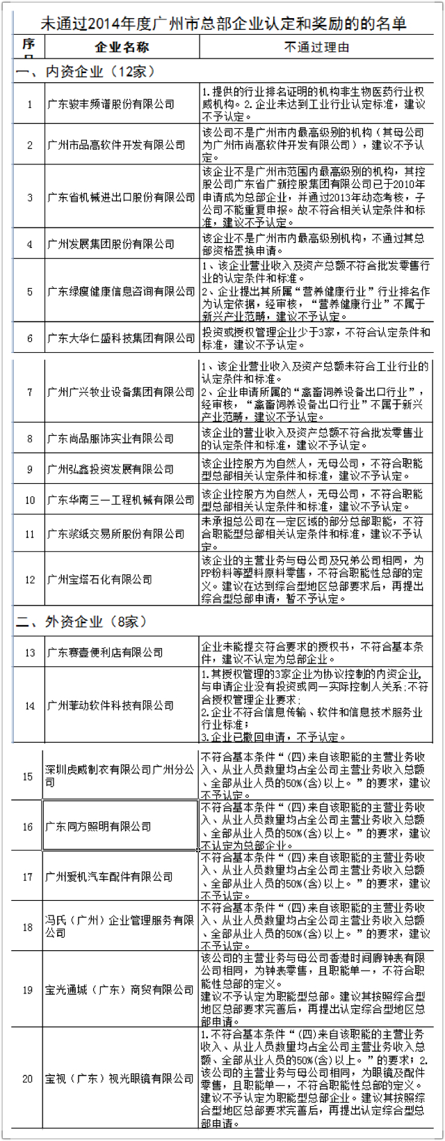 未通過廣州市2014年度總部企業(yè)認定和獎勵補貼的名單