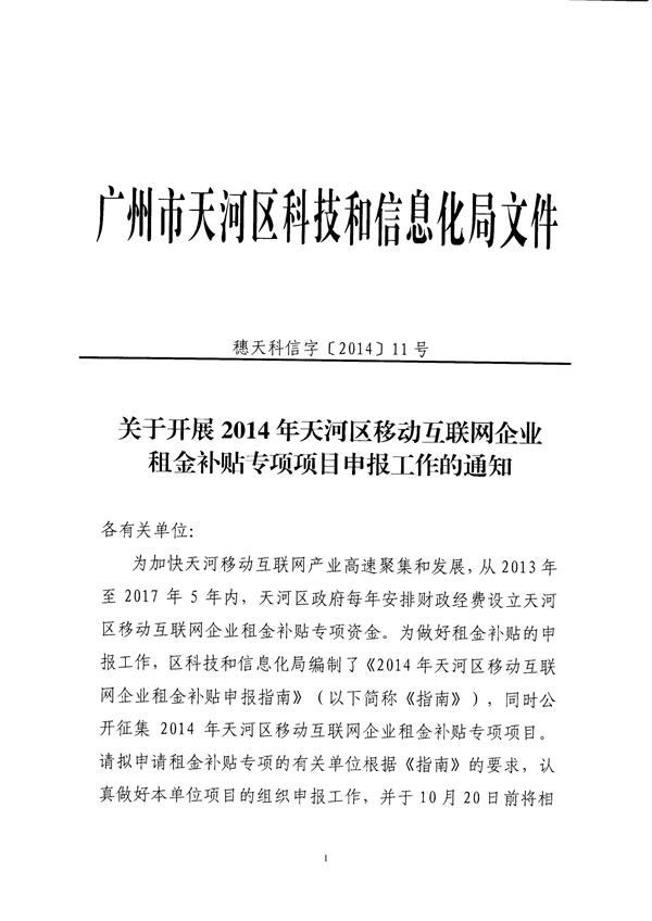 關(guān)于開展2014年天河區(qū)移動互聯(lián)網(wǎng)企業(yè)租金補貼專項項目申報工作的通知