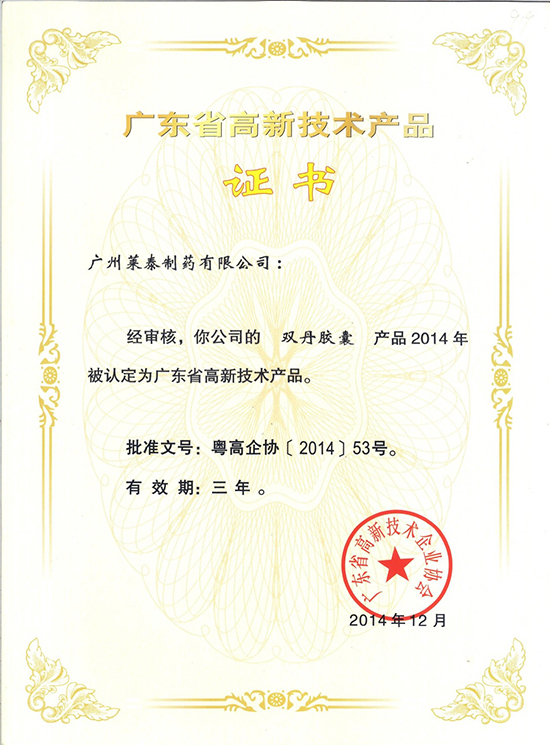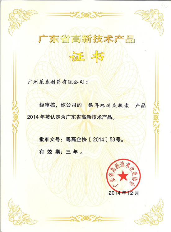 2014年12月,康采恩集團旗下子公司廣州萊泰制藥有限公司產(chǎn)品,經(jīng)過嚴格的層層審核,最終榮獲由廣東省高新技術(shù)企業(yè)協(xié)會頒發(fā)的“廣東省高新技術(shù)產(chǎn)品證書”。此次獲得高新產(chǎn)品認定的產(chǎn)品為雙丹膠囊、猴耳環(huán)消炎膠囊以及金菊五花茶顆粒。