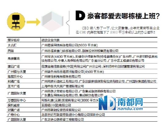 加拿大駐廣州總領事館、新西蘭駐廣州總領事館,將從中國大酒店搬進太古匯,而在中泰國際辦公多年的寶潔(P&G),也將帶著浩浩蕩蕩的人馬搬進高德置地H座兩層大樓……據(jù)悉,越來越多企業(yè),告別傳統(tǒng)商務區(qū),搬進了珠江新城嶄新的超甲級寫字樓里。近日,C B D君通過商業(yè)地產(chǎn)權威,拿到了一份《密件》,密件列出了2014年期間全市各大寫字樓簽下的租客及租用面積。現(xiàn)在,就讓C B D君來告訴你,天河C B D哪些寫字樓具有超強的吸客能力,里邊入駐的企業(yè)大拿都有誰。