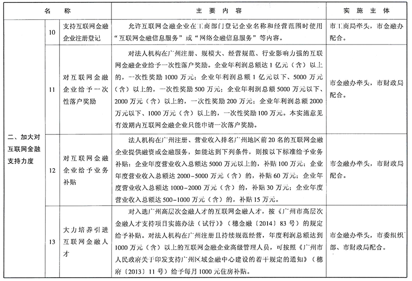 (十六)大力培養(yǎng)引進(jìn)互聯(lián)網(wǎng)金融人才。對(duì)入選廣州高層次金融人才的互聯(lián)網(wǎng)金融人才,按《廣州市高層次金融人才支持項(xiàng)目實(shí)施辦法(試行)》(穗金融〔2014〕83號(hào))的規(guī)定給予補(bǔ)貼。對(duì)法人機(jī)構(gòu)在廣州注冊(cè)且持續(xù)規(guī)范經(jīng)營(yíng),年度利潤(rùn)總額達(dá)到1000萬元(含)以上的互聯(lián)網(wǎng)金融企業(yè)高級(jí)管理人員,可按照《廣州市人民政府關(guān)于印發(fā)支持廣州區(qū)域金融中心建設(shè)的若干規(guī)定的通知》(穗府〔2013〕11號(hào))給予每月1000元住房補(bǔ)貼。