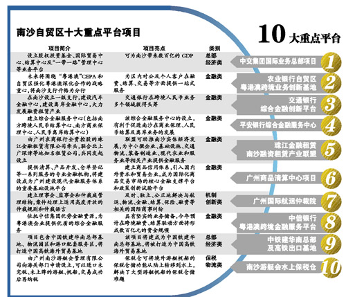 為增強自貿(mào)區(qū)輻射帶動作用,南沙將設立一批突出國際化特色和強化粵港澳合作的功能性平臺,其中首批10個于掛牌當日啟動。十大重點平臺項目中,金融類的占據(jù)六席;總部經(jīng)濟類占據(jù)兩席,分別是中交集團國際業(yè)務總部項目和中鐵建華南總部及高鐵出口基地。