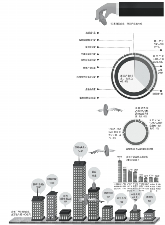 2014年,廣州市主營業(yè)務(wù)收入100億元以上的企業(yè)有93家,較上年的87家增加6家,增速為7%;主營業(yè)務(wù)總收入達(dá)4.2萬億元,較上年增長10 .5%。