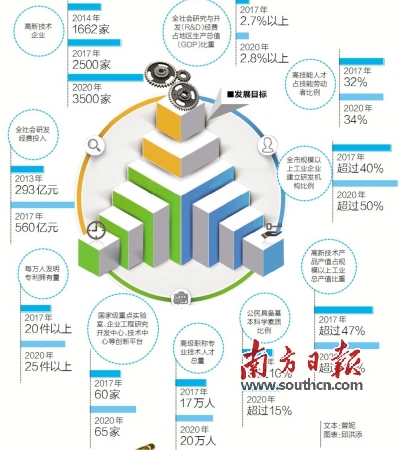 到2020年,將廣州建成體制創(chuàng)新、機制健全的國家區(qū)域創(chuàng)新平臺,具有國際影響力的國家創(chuàng)新中心,形成開放、寬松、自由的創(chuàng)新生態(tài)。”2日召開的廣州市科技創(chuàng)新大會上,出臺了推動廣州創(chuàng)新驅動的“1+9”文件。其中,“1”為主體文件《廣州市人民政府關于加快實施創(chuàng)新驅動發(fā)展戰(zhàn)略的決定》,其中明確:廣州要大幅提高創(chuàng)新投入,2017年和2020年全社會研究與開發(fā)(R&D)經(jīng)費占地區(qū)生產(chǎn)總值(GDP)的比重分別達2.7%和2.8%以上。