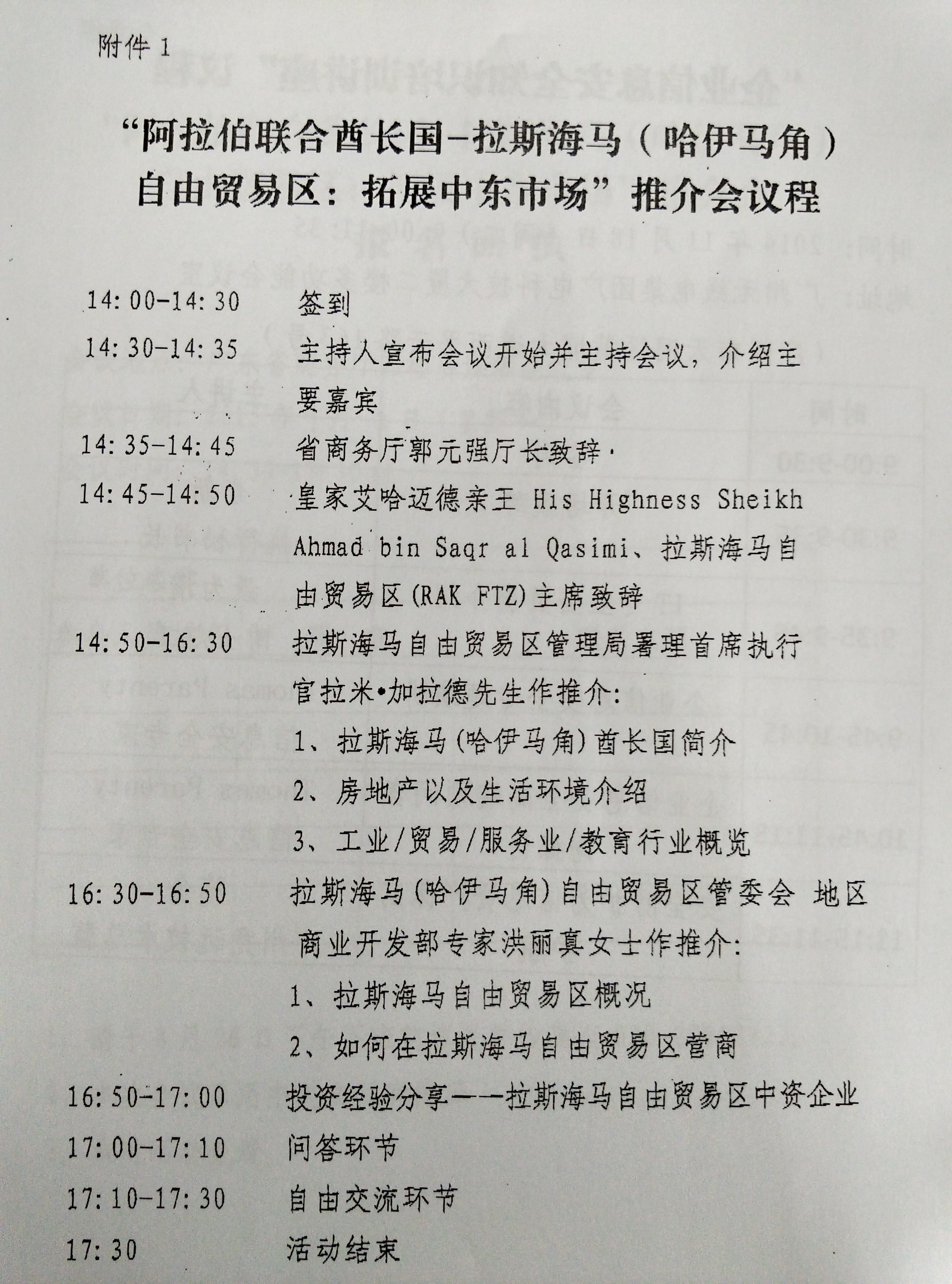 1、“阿拉伯聯(lián)合酋長國-拉斯海馬自由貿(mào)易區(qū):拓展中東市場”推介會(huì)議程;
