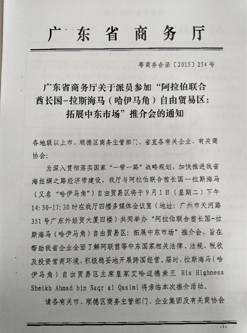 為深入貫徹落實(shí)國家“一帶一路”戰(zhàn)略規(guī)劃,加快推進(jìn)我省海絲綢之路經(jīng)濟(jì)帶建設(shè),省商務(wù)廳與阿拉伯酋長國-拉斯海馬(又名哈伊馬角)自由貿(mào)易區(qū)于9月1日(星期二)下午14:30-17:30在廣東外經(jīng)貿(mào)大廈四樓多媒體會(huì)議室共同舉辦“阿拉伯聯(lián)合酋長國-拉斯海馬自由貿(mào)易區(qū):拓展中東市場”推介會(huì)。廣州市總部經(jīng)濟(jì)協(xié)會(huì)按照廣東省商務(wù)廳工作委托,組織相關(guān)企業(yè)報(bào)名參加,現(xiàn)將省商務(wù)廳有關(guān)通知轉(zhuǎn)發(fā)給各單位。參會(huì)企業(yè)請按要求填妥相關(guān)附件,并于8月28日12:00前發(fā)送至我會(huì)郵箱:gzhea@vip.163.com。