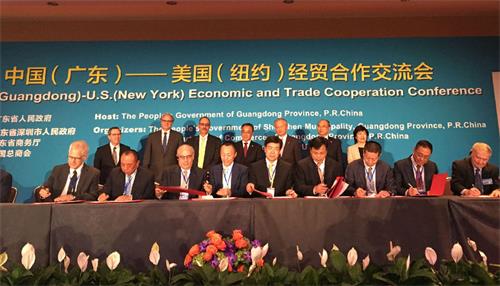 中國(廣東)-美國(紐約)經(jīng)貿(mào)合作交流會(huì)簽約儀式,右二為廣發(fā)證券董事長孫樹明
