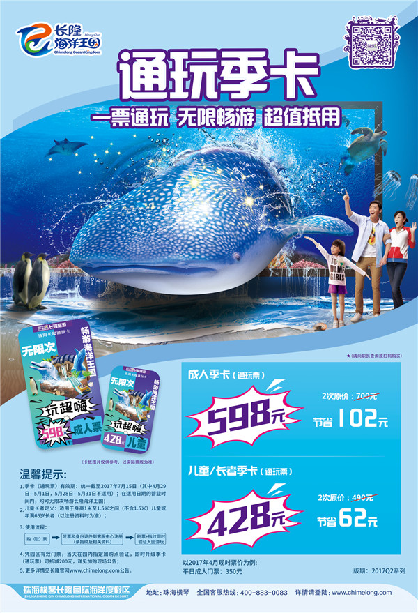 成人598元/張,兒童/長者428元/張,適用于長隆海洋王國。