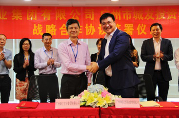 珠江實(shí)業(yè)集團(tuán)董事長鄭暑平(左)和城發(fā)基金董事長林旭初(右)作為雙方代表正式簽署《戰(zhàn)略合作協(xié)議》