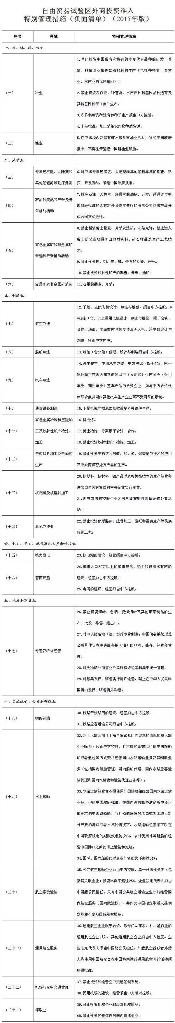 《自由貿(mào)易試驗區(qū)外商投資準入特別管理措施(負面清單)(2017年版)》自2017年7月10日起實施。2015年4月8日印發(fā)的《自由貿(mào)易試驗區(qū)外商投資準入特別管理措施(負面清單)》同時廢止。