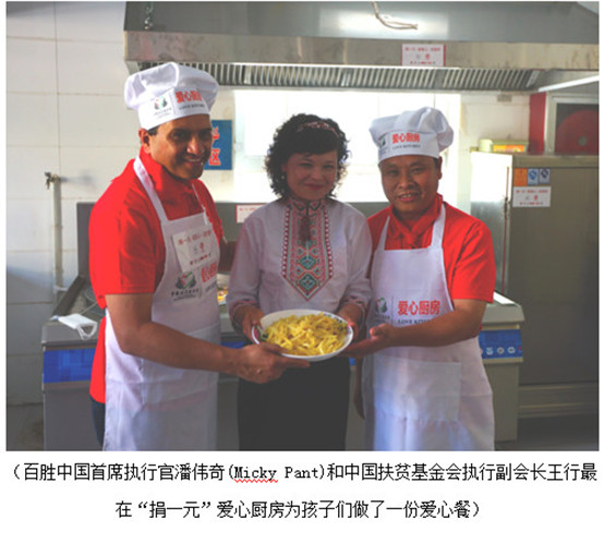 百勝中國(guó)首席執(zhí)行官潘偉奇(Micky Pant)、中國(guó)扶貧基金會(huì)執(zhí)行副會(huì)長(zhǎng)王行最、新疆自治區(qū)紀(jì)委常委阿迪力-艾力、阿克陶縣委書記谷文勝等領(lǐng)導(dǎo),與百勝中國(guó)員工代表一起來(lái)到了這所位于中國(guó)西北邊陲的鄉(xiāng)村小學(xué),將凝聚著千萬(wàn)消費(fèi)者與百勝中國(guó)員工愛(ài)心的營(yíng)養(yǎng)餐分發(fā)到全校430多名小學(xué)生手里。同時(shí),百勝中國(guó)為該校捐贈(zèng)的一套全新“愛(ài)心廚房”設(shè)備也已安裝完畢,從此之后,孩子們可以在學(xué)校吃上更營(yíng)養(yǎng)更健康的餐食。