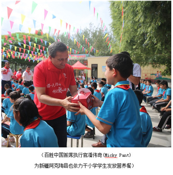 為貧困地區(qū)的孩子添加營(yíng)養(yǎng)餐,是百勝中國(guó)旗下公益項(xiàng)目“捐一元”的核心使命,該項(xiàng)目百勝中國(guó)一做就是十年。“捐一元”項(xiàng)目由中國(guó)扶貧基金會(huì)攜手百勝中國(guó)于2008年共同發(fā)起,通過(guò)百勝中國(guó)旗下遍布全國(guó)的肯德基、必勝客等餐廳向社會(huì)勸募,號(hào)召消費(fèi)者捐出一元錢,幫助貧困地區(qū)的孩子每天能吃上牛奶和雞蛋。此次新疆之行,標(biāo)志著“捐一元”項(xiàng)目第十年活動(dòng)正式啟動(dòng)。