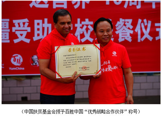 發(fā)餐儀式上的中國(guó)扶貧基金會(huì)執(zhí)行副會(huì)長(zhǎng)王行最高度認(rèn)可百勝中國(guó)十年如一日的堅(jiān)持,他代表基金會(huì)授予百勝中國(guó)“優(yōu)秀戰(zhàn)略合作伙伴”的稱號(hào)。王行最副會(huì)長(zhǎng)說(shuō):“‘捐一元’項(xiàng)目能取得如今的成果,與百勝中國(guó)及其全體員工的努力和投入分不開。通過(guò)前9年共同的推進(jìn),該項(xiàng)目所倡導(dǎo)的‘人人公益’和‘勿以善小而不為’的公益理念已被越來(lái)越多的公眾接受。”
