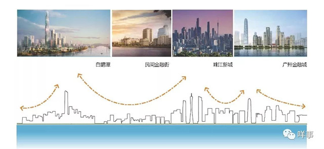 在濱江或者濱海區(qū)域,指引要求通過組合超高層地標(biāo)、主要高層建筑、肌理建筑、低層標(biāo)志性建筑四類一起組成簇群,打造層次豐富的城市天際線。通過控制與整合各個建筑的功能、形態(tài)、色彩、材質(zhì),形成城市的地標(biāo)系統(tǒng),結(jié)合夜景照,豐富人們對城市天際線的感知和體驗。