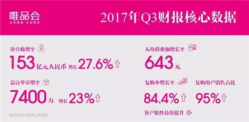 根據(jù)最新數(shù)據(jù)顯示,唯品會(huì)人均消費(fèi)額達(dá)643元,用戶(hù)復(fù)購(gòu)率達(dá)84.4%!11月21日,美股上市的特賣(mài)電商唯品會(huì)公布了截至2017年9月30日未經(jīng)審計(jì)的第三季度財(cái)務(wù)報(bào)告↓↓↓