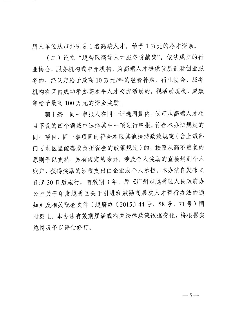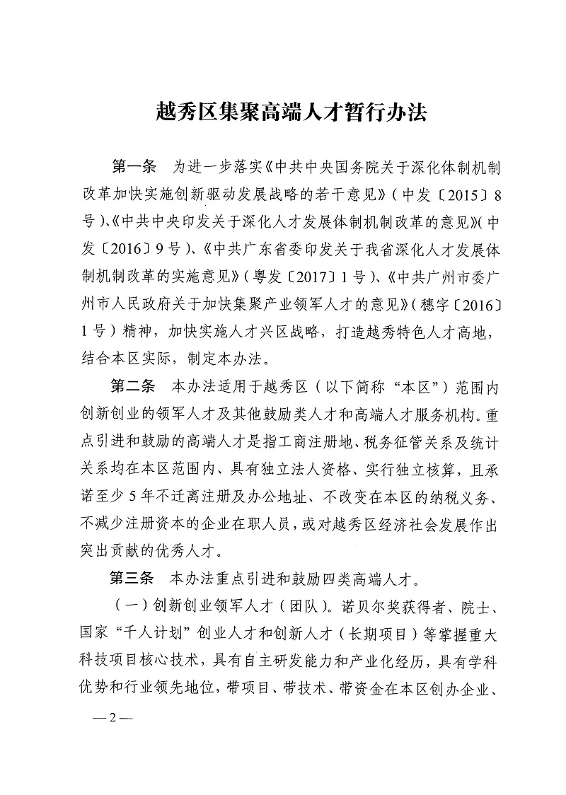 廣州市越秀區(qū)人民政府辦公室關(guān)于印發(fā)越秀區(qū)集聚高端人才暫行辦法的通知