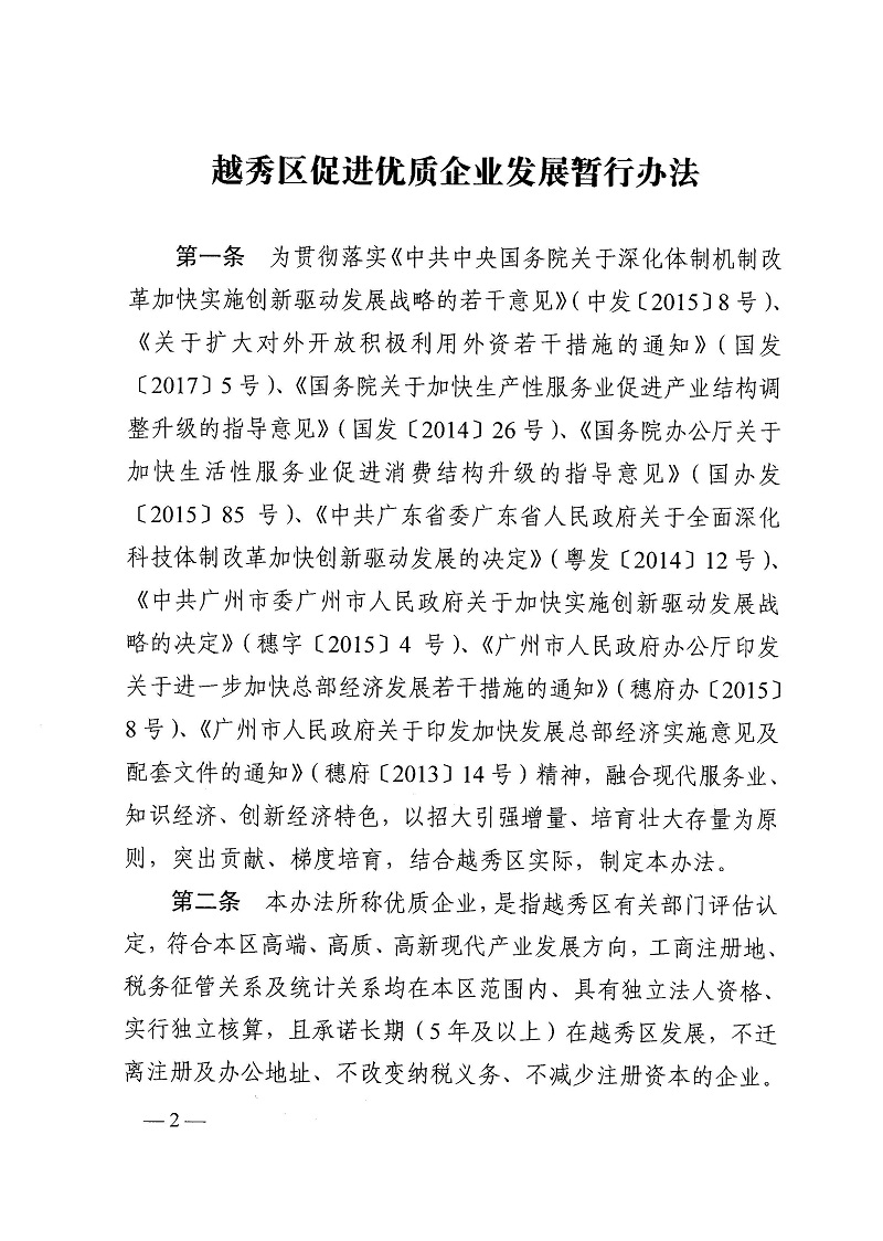 廣州市越秀區(qū)人民政府辦公室關(guān)于印發(fā)越秀區(qū)促進(jìn)優(yōu)質(zhì)企業(yè)發(fā)展暫行辦法的通知