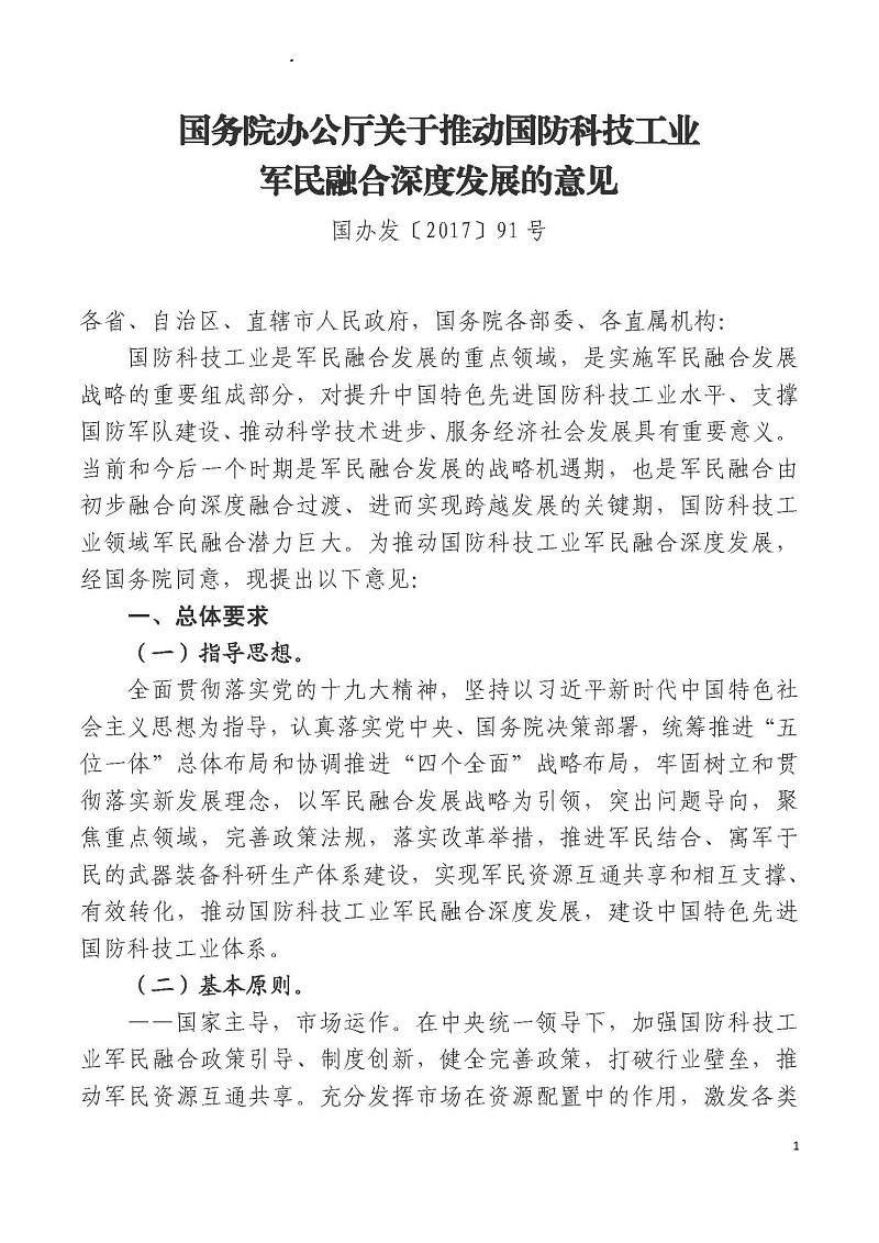 國(guó)務(wù)院辦公廳關(guān)于推動(dòng)國(guó)防科技工業(yè)軍民融合深度發(fā)展的意見(jiàn)