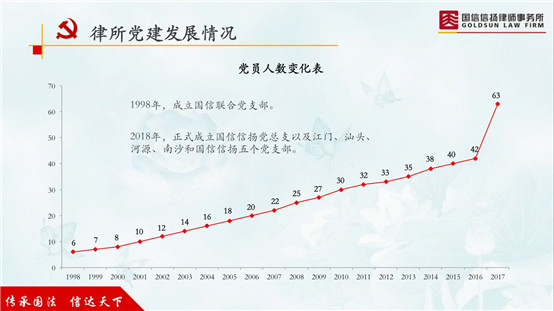國信信揚重視黨建工作。從1998年成立之初的6名黨員發(fā)展到現(xiàn)今的63名黨員,并在2018年批準(zhǔn)成立黨總支部,設(shè)立江門、汕頭、河源、南沙和國信信揚五個黨支部。在十九大精神的指引下,以黨建促所建,充分發(fā)揮黨員先鋒模范和監(jiān)督作用,不斷實現(xiàn)黨建工作常態(tài)化的健康發(fā)展。