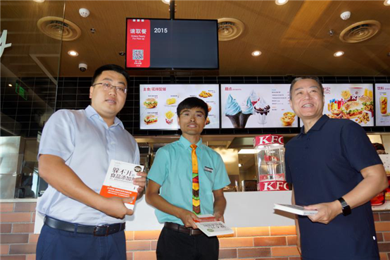 中國經(jīng)濟網(wǎng)常務(wù)副總經(jīng)理雷越向肯德基餐廳管理人員贈送食品安全科普書籍
