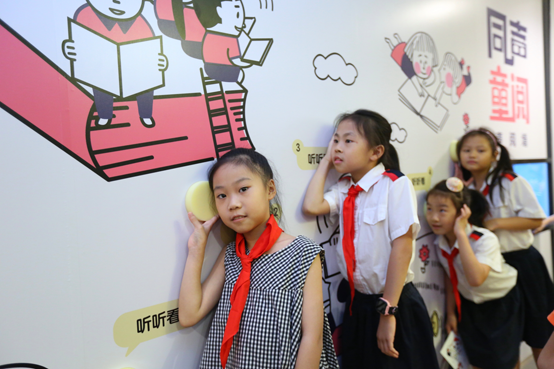 (孩子們在肯德基聲閱推廣基地的聲閱墻前俯耳傾聽有聲故事)