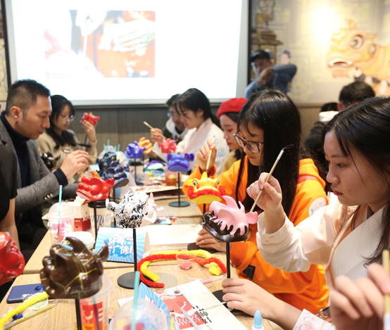 同一天,在廣州光明廣場廣府文化肯德基的“粵潮墟”,來自佛山的獅頭文化,則為廣州年輕人們帶來了顛覆的體驗(yàn)。曾被聯(lián)合國教科文組織、中國可持續(xù)發(fā)展教育全國工作委員會授予“中國可持續(xù)發(fā)展教育優(yōu)秀人物”稱號的歐琦輝老師,向年輕人展示了如何讓傳統(tǒng)獅扎插上創(chuàng)意的翅膀:從單一的獅頭到衍生品,再到結(jié)合現(xiàn)代工藝的3D打印,歐老師更讓獅頭文化與磁懸浮的高科技聯(lián)系在一起。細(xì)心欣賞歐老師制作的曾登上央視一套節(jié)目的3D磁懸浮獅頭,黃白的燈光從鏤空的獅頭中散出來,獅頭的紋樣、祥云和金箔在燈光的照射下,顯出不同的色彩。歐老師還帶來了造型精致的獅頭信箱,名為《獅享》,寓意“將思想分享,守護(hù)一生的愛”。年輕參與者們可為獅頭信箱點(diǎn)上青春的色彩,并寫下內(nèi)心說話,放進(jìn)親手制作的獅頭信箱中,這就成為了既有故事,又有文化內(nèi)涵的文創(chuàng)產(chǎn)品。