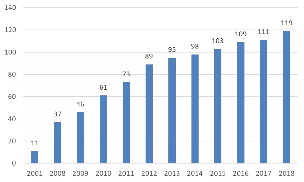 2001年以來進入《財富》世界500強的中國大陸(包括香港)企業(yè)數(shù)量