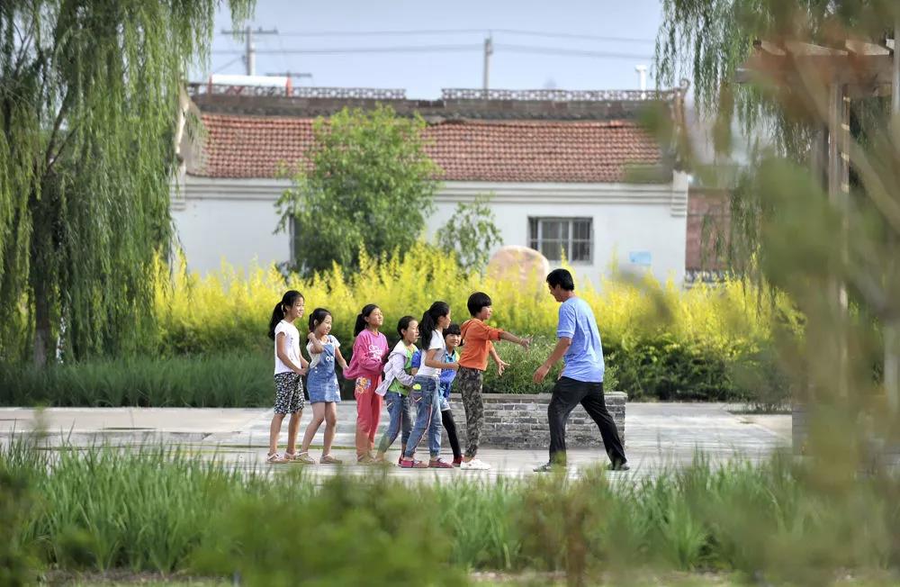 寧夏永寧縣原隆村的孩子們在新居前的休閑廣場上玩耍(2018年8月攝)。新華社記者 劉軍喜 攝
