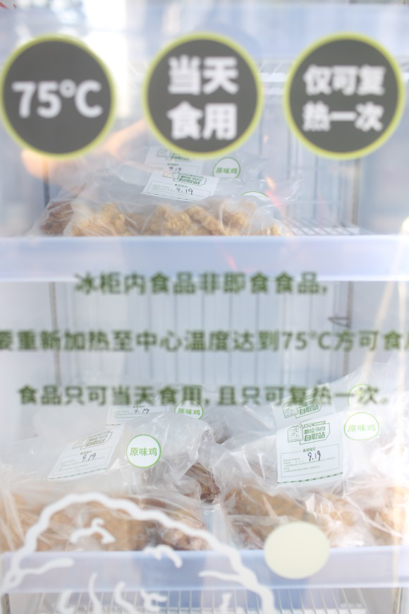 記者取出食物銀行內(nèi)的一袋“原味雞”,包裝袋上的食用指引信息非常醒目。“冰柜內(nèi)食品非即食食品,需要重新加熱至中心溫度達(dá)到75度方可食用”、“食品只可當(dāng)天食用,且只可復(fù)熱一次。”