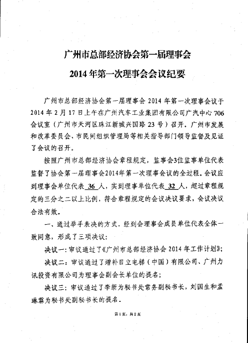 2月17日,廣州市總部經(jīng)濟協(xié)會(以下簡稱:市總部經(jīng)濟協(xié)會)第一屆理事會2014年第一次理事會在廣汽中心隆重召開。市發(fā)展和改革委員會陳浩鈿副主任、服務(wù)業(yè)處馬奎處長、市民間組織管理局莊承汶副局長、張房有會長及理事會成員企業(yè)代表近60人出席會議。會議審議通過了協(xié)會2014年工作計劃,增補了2個副會長單位,增補了秘書處1名常務(wù)副秘書長和2名秘書處副秘書長。