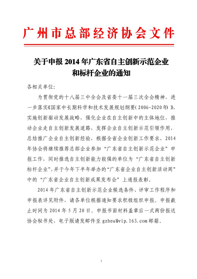 關(guān)于申報(bào)2014年廣東省自主創(chuàng)新示范企業(yè)的通知