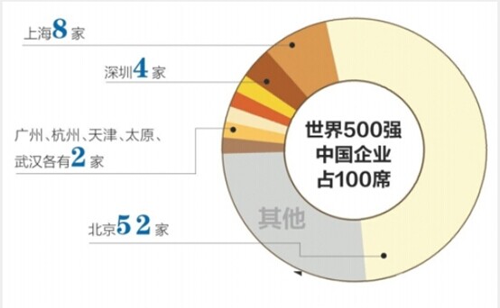 中國100家入圍企業(yè)中,北上廣深四個一線城市狂攬66個席位,其中,北京以52家入榜企業(yè)的成績遙遙領(lǐng)先于國內(nèi)其他城市,上海以8家企業(yè)緊隨其后,深圳有4家入榜企業(yè),位列第三,廣州、杭州、天津、太原、武漢各有2家世界500強。