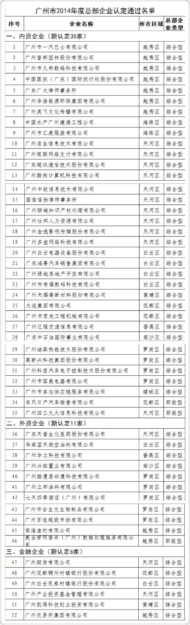 根據(jù)《廣州市人民政府關(guān)于印發(fā)加快發(fā)展總部經(jīng)濟實施意見及配套文件的通知》(穗府〔2013〕14號),經(jīng)市人民政府同意,廣州市一汽巴士有限公司等52家企業(yè)(見附件)為2014年度新認定總部企業(yè),現(xiàn)予以公布。請各有關(guān)單位加快建設(shè)高層次的總部經(jīng)濟發(fā)展載體,完善總部經(jīng)濟政策支持體系和專業(yè)服務(wù)支撐體系,打造適宜總部經(jīng)濟發(fā)展的營商、人文和居住環(huán)境,為廣州打造區(qū)域總部經(jīng)濟中心做出新貢獻。