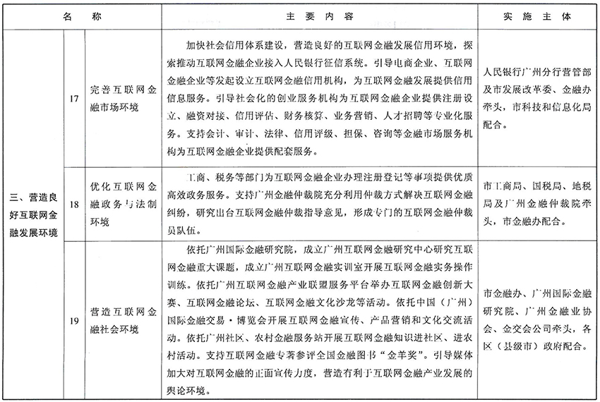 (二十一)優(yōu)化互聯(lián)網(wǎng)金融政務(wù)與法制環(huán)境。工商、稅務(wù)等部門為互聯(lián)網(wǎng)金融企業(yè)辦理注冊(cè)登記等事項(xiàng)提供優(yōu)質(zhì)高效政務(wù)服務(wù)。支持廣州金融仲裁院充分利用仲裁方式解決互聯(lián)網(wǎng)金融糾紛,研究出臺(tái)互聯(lián)網(wǎng)金融仲裁指導(dǎo)意見,形成專門的互聯(lián)網(wǎng)金融仲裁員隊(duì)伍。