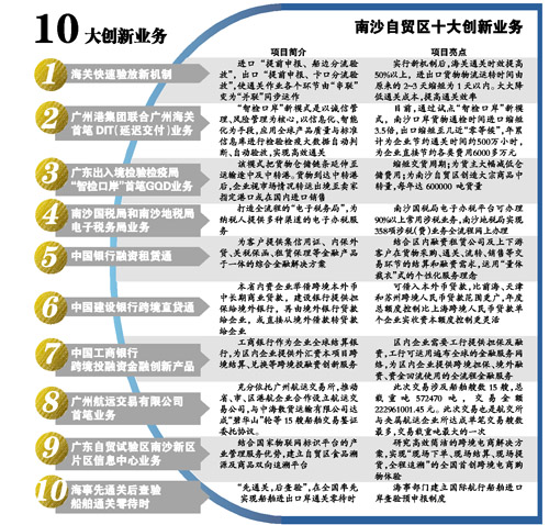 全國首創(chuàng)的海關(guān)快速驗放新機制,進出口貨物物流運轉(zhuǎn)時間由原來的2~3天縮短為1天以內(nèi);全國檢驗檢疫首創(chuàng)的“智檢口岸”,出口縮短至幾近“零等候”;一個平臺項目就可為南沙帶來數(shù)百億的GDP!昨天,廣州市發(fā)布了南沙自貿(mào)區(qū)10大創(chuàng)新業(yè)務,啟動了南沙自貿(mào)區(qū)10大平臺,并為首日落戶南沙自貿(mào)區(qū)的100家新設企業(yè)頒發(fā)了營業(yè)執(zhí)照,南沙創(chuàng)新業(yè)務實現(xiàn)多個全國首創(chuàng),凸顯了“南沙速度”。