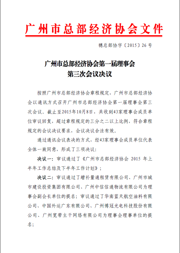 按照廣州市總部經(jīng)濟(jì)協(xié)會(huì)章程規(guī)定,廣州市總部經(jīng)濟(jì)協(xié)會(huì)以通訊方式召開廣州市總部經(jīng)濟(jì)協(xié)會(huì)第一屆理事會(huì)第三次會(huì)議。截止至2015年10月8日,共收到43家理事會(huì)成員單位審議回復(fù),超過章程規(guī)定的三分之二以上比例,符合章程規(guī)定的會(huì)議決議要求,會(huì)議決議合法有效。