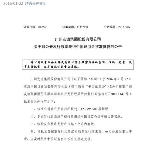 新華網(wǎng)廣東頻道從越秀金控集團(tuán)獲悉,廣州友誼于今日午間發(fā)布《關(guān)于非公開發(fā)行股票獲得中國(guó)證監(jiān)會(huì)核準(zhǔn)批復(fù)的公告》,核準(zhǔn)公司非公開發(fā)行不超過(guò) 1123595502 股新股,且該批復(fù)自核準(zhǔn)發(fā)行之日起6個(gè)月內(nèi)有效。