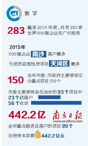 記者注意到,自去年至今到穗投資的世界500強企業(yè)紛至沓來。據(jù)統(tǒng)計截至2015年底,共有283家世界500強企業(yè)在廣州投資。其中,在自貿試驗區(qū)效應帶動下,《財富》世界500強、中國企業(yè)500強、央企在穗投資項目落戶最多的均為南沙區(qū)。自貿試驗區(qū)掛牌一年來,南沙已有50個世界500強企業(yè)投資落戶。越秀、天河等區(qū)也于今年引進了不少世界500強企業(yè)項目,包括中航工業(yè)集團下屬中航毅泰融資租賃、中國通用技術集團下屬環(huán)球醫(yī)療融資租賃,以及拉卡拉支付(聯(lián)想控股集團投資)、普天新能源(中海油集團投資)、中建基礎華南總部(中建集團投資)等一批世界500強項目。