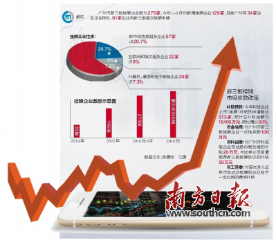 數(shù)據(jù)顯示,2014年-2016年,廣州新三板掛牌企業(yè)數(shù)量增速不斷提升。其中,2014年增加35家,2015年增加109家。今年僅1-8月份,就增加了129家,增速是去年同期的2.95倍。預(yù)計(jì),今年廣州將新增200家新三板企業(yè)。