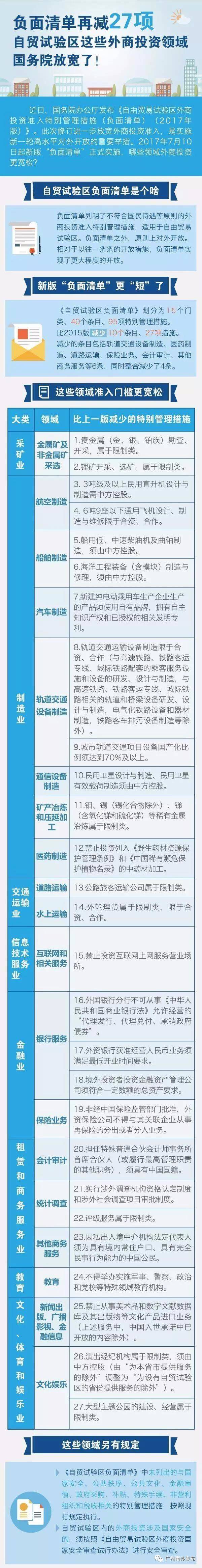 日前,國務(wù)院辦公廳發(fā)布《自由貿(mào)易試驗區(qū)外商投資準入特別管理措施(負面清單)(2017年版)》。2017年7月10日起新版“負面清單”正式實施,哪些領(lǐng)域外商投資更寬松?一圖快速了解妥妥滴~~