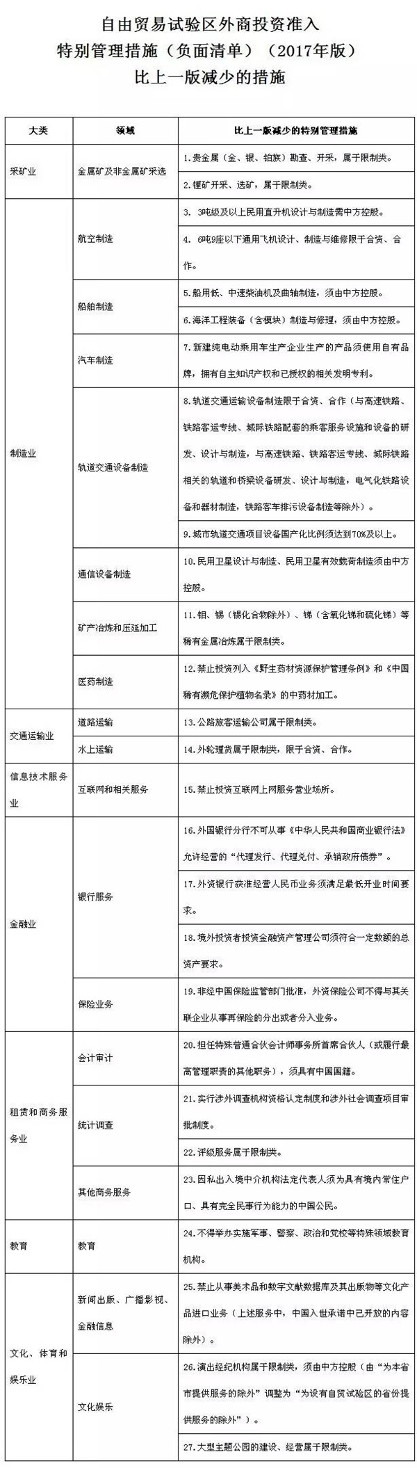 *注:《自由貿(mào)易試驗區(qū)外商投資準入特別管理措施(負面清單)(2017年版)》與上一版相比,共減少了10個條目、27項措施。其中,減少的條目包括軌道交通設(shè)備制造、醫(yī)藥制造、道路運輸、保險業(yè)務(wù)、會計審計、其他商務(wù)服務(wù)等6條,同時整合減少了4條。