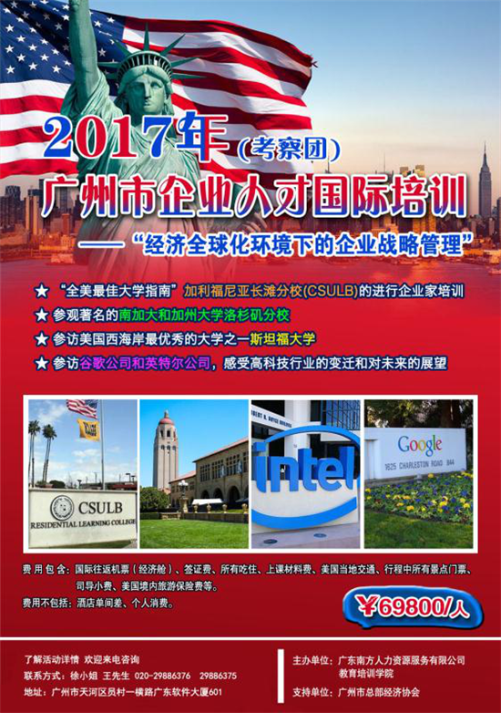 根據《中共廣州市委 廣州市人民政府關于加快集聚產業(yè)領軍人才的意見》的精神,貫徹落實中央和省關于加快實施創(chuàng)新驅動發(fā)展戰(zhàn)略的決策部署,大力實施人才強市戰(zhàn)略,充分發(fā)揮產業(yè)領軍人才在集聚中高端產業(yè)、實現經濟中高速發(fā)展等方面的引領作用,加快推動廣州三大戰(zhàn)略樞紐、“三中心一體系”和國家創(chuàng)新中心城市建設,打造高端高質高新現代產業(yè)新體系。廣州市總部經濟協會聯合廣東南方人力資源服務有限公司教育培訓學院組織企業(yè)選派技術和管理人員赴國外聽課、研修,學習先進生產技術、科學管理經驗。