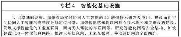 大力推動(dòng)智能化信息基礎(chǔ)設(shè)施建設(shè),提升傳統(tǒng)基礎(chǔ)設(shè)施的智能化水平,形成適應(yīng)智能經(jīng)濟(jì)、智能社會(huì)和國防建設(shè)需要的基礎(chǔ)設(shè)施體系。加快推動(dòng)以信息傳輸為核心的數(shù)字化、網(wǎng)絡(luò)化信息基礎(chǔ)設(shè)施,向集融合感知、傳輸、存儲(chǔ)、計(jì)算、處理于一體的智能化信息基礎(chǔ)設(shè)施轉(zhuǎn)變。優(yōu)化升級(jí)網(wǎng)絡(luò)基礎(chǔ)設(shè)施,研發(fā)布局第五代移動(dòng)通信(5G)系統(tǒng),完善物聯(lián)網(wǎng)基礎(chǔ)設(shè)施,加快天地一體化信息網(wǎng)絡(luò)建設(shè),提高低時(shí)延、高通量的傳輸能力。統(tǒng)籌利用大數(shù)據(jù)基礎(chǔ)設(shè)施,強(qiáng)化數(shù)據(jù)安全與隱私保護(hù),為人工智能研發(fā)和廣泛應(yīng)用提供海量數(shù)據(jù)支撐。建設(shè)高效能計(jì)算基礎(chǔ)設(shè)施,提升超級(jí)計(jì)算中心對人工智能應(yīng)用的服務(wù)支撐能力。建設(shè)分布式高效能源互聯(lián)網(wǎng),形成支撐多能源協(xié)調(diào)互補(bǔ)、及時(shí)有效接入的新型能源網(wǎng)絡(luò),推廣智能儲(chǔ)能設(shè)施、智能用電設(shè)施,實(shí)現(xiàn)能源供需信息的實(shí)時(shí)匹配和智能化響應(yīng)。